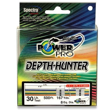 Do you ever wonder how deep your bait is, or how far behind your boat you are trolling your favorite lure, or even how far than explosive cast went? Well wonder no more! Introducing a new metered-line called Depth-Hunter from PowerPro. Paragraph: There are 4-colors (Blue/Yellow/Green/Orange), with 25 feet of color per segment that repeats every 100 feet. There is also a black tic marking every 5 feet for accurate and instant depth measurement. This allows you to present your lure in the strike zone easily, accurately and repeatedly. This is only available from PowerPro. Paragraph: Tip: If you ever need depth/casting distance on your reel, spool up with Depth Hunter because it casts and performs just like regular PowerPro and this way you have it on your reel when you need it - also segmented line will appear to break up (camouflage) in water.