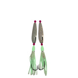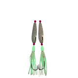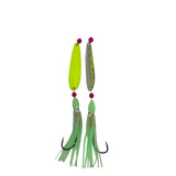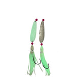 Custom-made cod Hi-Lo Double Spoon Rig (color Side Glows and and the other side shines), with Squid Skirts, for targeting in-shore or offshore Cod