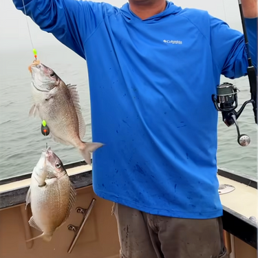 Custom-made high-low rig for porgies and Seabass With Super Glow Beads.