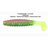 Slider Crappie Grub is an original design by Charlie Brewer from the mid 1970's that has been proven to be very effective for crappie, panfish and even bass. They feature soft colorful bodies with an enticing vibratail that has just enough tail action to attract fish. These Crappie Grubs are great for casting, trolling or vertical jigging.