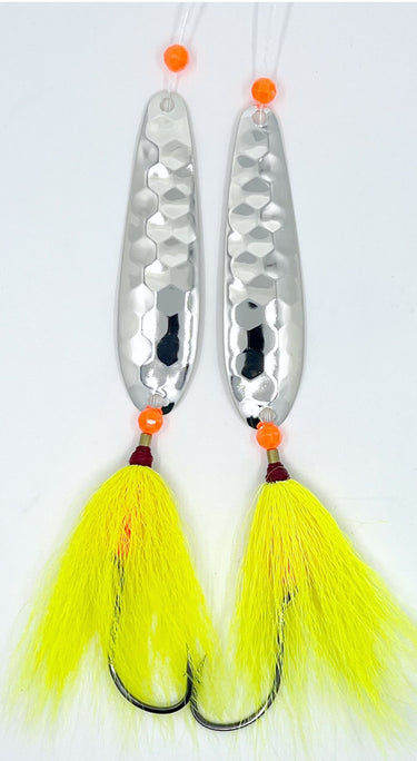 Custom-made Doormat Fluke Hi-Lo Double Spoon Rig, with bucktail teasers, for targeting in-shore fluke and off-shore double-digit doormats.