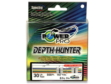 Do you ever wonder how deep your bait is, or how far behind your boat you are trolling your favorite lure, or even how far than explosive cast went? Well wonder no more! Introducing a new metered-line called Depth-Hunter from PowerPro. Paragraph: There are 4-colors (Blue/Yellow/Green/Orange), with 25 feet of color per segment that repeats every 100 feet. There is also a black tic marking every 5 feet for accurate and instant depth measurement. This allows you to present your lure in the strike zone easily, accurately and repeatedly. This is only available from PowerPro. Paragraph: Tip: If you ever need depth/casting distance on your reel, spool up with Depth Hunter because it casts and performs just like regular PowerPro and this way you have it on your reel when you need it - also segmented line will appear to break up (camouflage) in water.