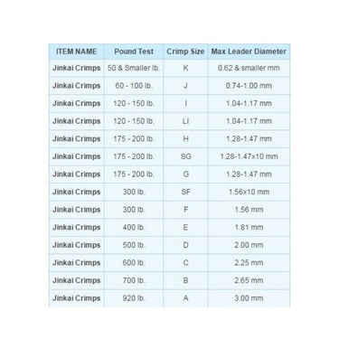 Jinkai Crimps are made from a special aluminum alloy that is easy to crimp and resists electro-corrosion in saltwater. The soft metal and oval shape work together to provide a permanent crimp without compromising line strength. A wide variety of sizes coordinate for use with all lb. tests of Jinkai line. Available in packages of 50.